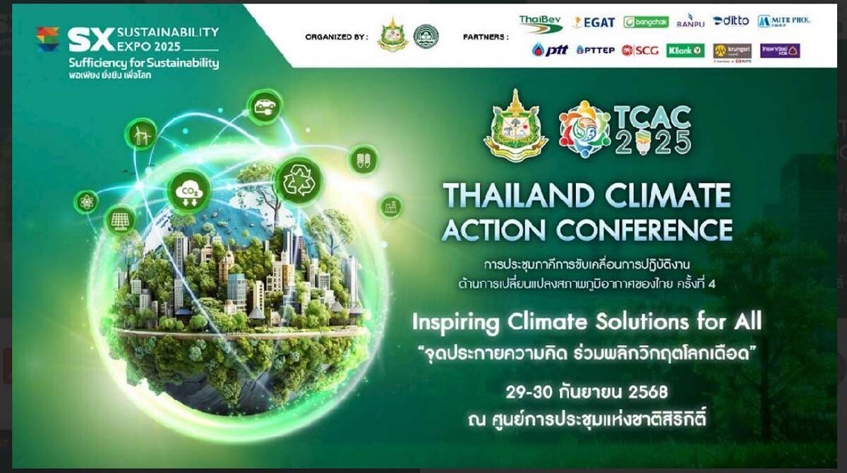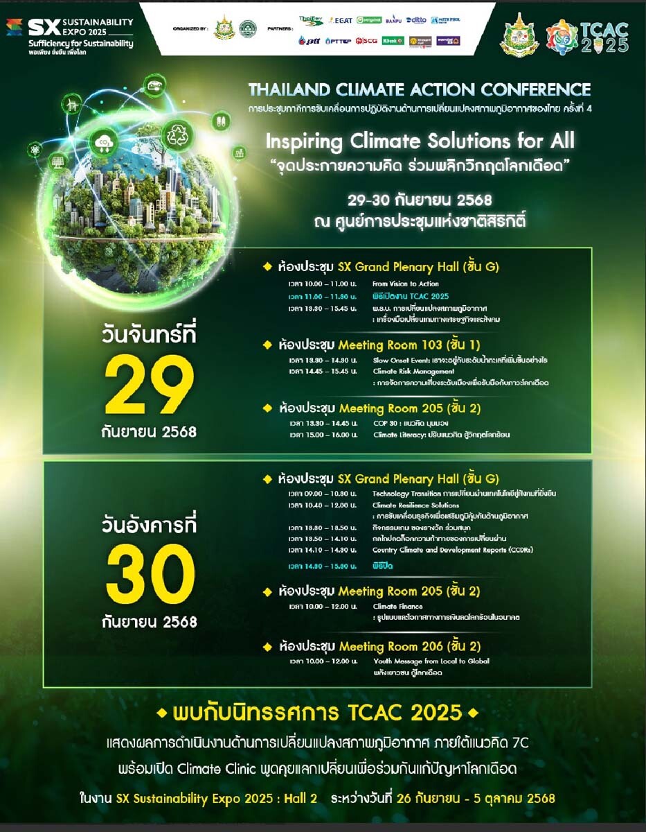 29 กันยายน 2568 – นายสุชาติ ชมกลิ่น รองนายกรัฐมนตรีและรัฐมนตรีว่าการกระทรวงทรัพยากรธรรมชาติและสิ่งแวดล้อม เป็นประธานเปิดการประชุมภาคีการขับเคลื่อนการปฏิบัติงานด้านการเปลี่ยนแปลงสภาพภูมิอากาศของไทย ครั้งที่ 4 หรือ Thailand Climate Action Conference: TCAC 2025 ภายใต้แนวคิด “จุดประกายความคิด ร่วมพลิกวิกฤตโลกเดือด – Inspiring Climate Solutions for All” โดยมีคณะรัฐมนตรี สมาชิกสภาผู้แทนราษฎร เอกอัครราชทูต องค์กรระหว่างประเทศ ผู้บริหารหน่วยงานภาครัฐ ภาคเอกชน ผู้ว่าราชการจังหวัด ร่วมการประชุม กว่า 2,000 คน ณ ศูนย์การประชุมแห่งชาติสิริกิติ์ ภายในงาน Sustainability Expo (SX)